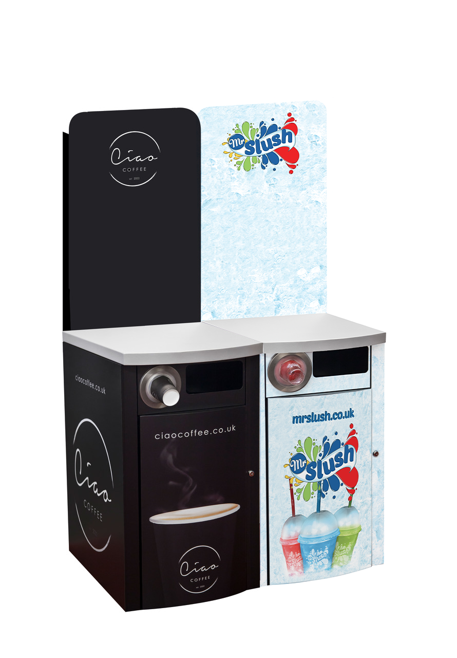 Combined serving slush and coffee station, custom designed to site the Ciao VS1 bean to cup coffee machine and our best selling Sencotel 2x12Ltr Mr Slush Freazy machine. The Sencotel triple tank slush machine is also available upon request.
